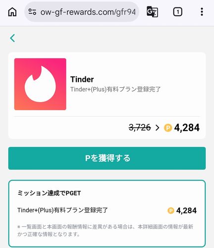 モッピー(アプリBOX=GF Rewards)で1680円課金で4284円即付与。Tinder+の課金案件は今の所Androidのみ掲載。ちなみに以前は月額1200円でしたが最近週1680円に値上げさ […]