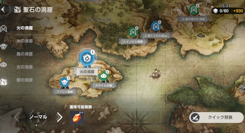 「たいまつ」を消費して行ける聖石の洞窟ではコスチューム強化に必要な各属性聖石が収集できます。