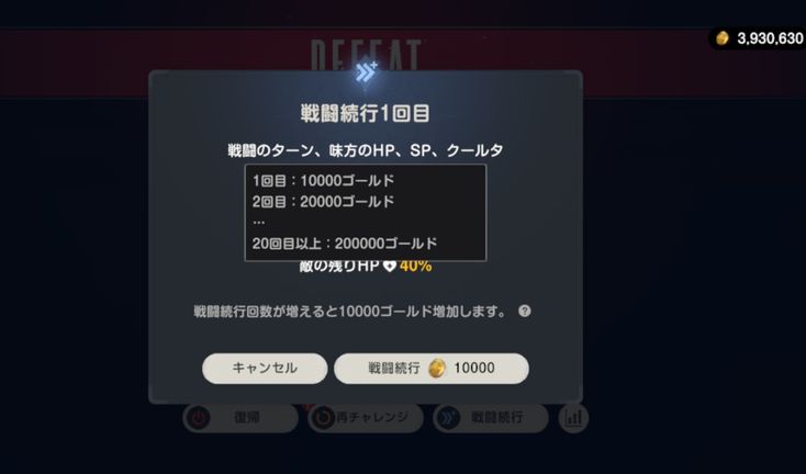 戦闘続行(コンティニュー機能)は1回ごとに10000ゴールド必要です。