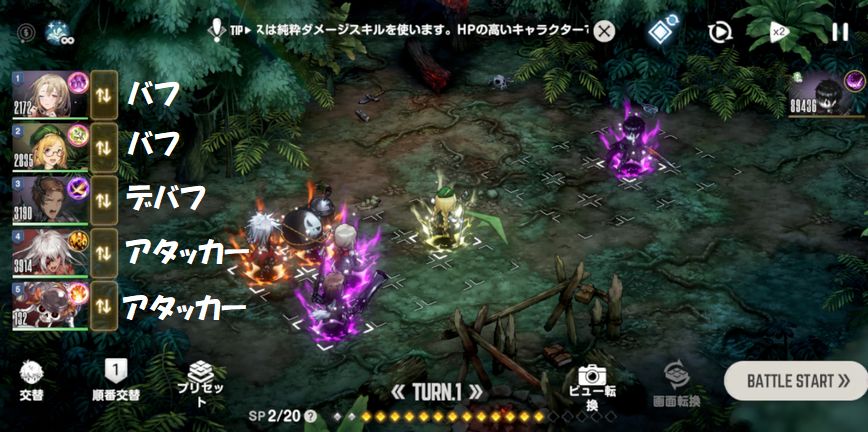 戦闘の行動順は最初にバフ・デバフ→次にアタッカーを配置しましょう。
