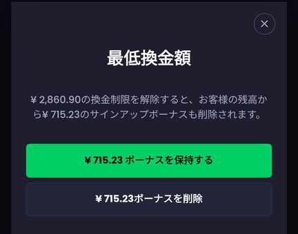 尚登録時に獲得したボーナス分を破棄すると、この換金制限は無くなります。私はボーナスも貰いたかったので2860円貯めてから換金しました。