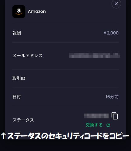 「換金」タブの「あなたの換金履歴」からセキュリティコードをコピーして、交換するをタップ。出金可能になると登録したメールアドレスにもセキュリティコードが届きます。