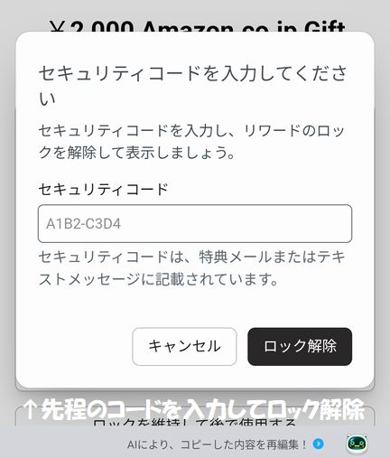 コード発行画面で先程のセキュリティコードを入力して「ロック解除」。