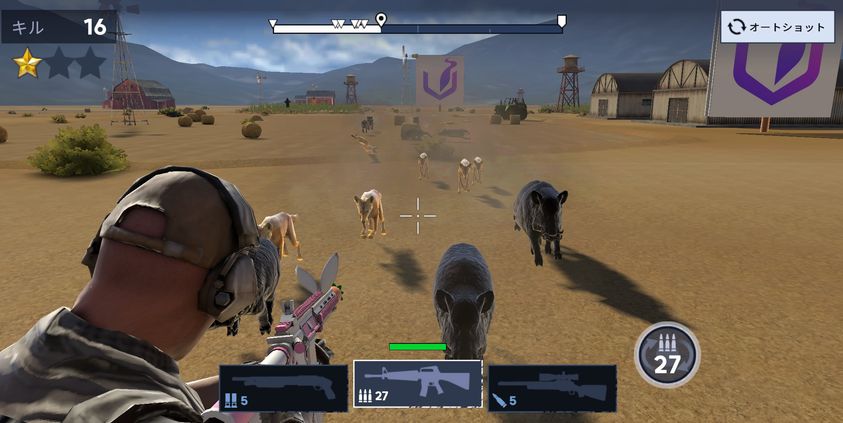 ステージ内画面右上のオートショットをオンにして、敵の頭に標準を合わせてヘッドショットを狙いながら倒していきましょう。