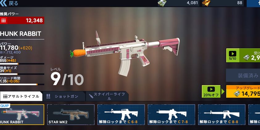 7日目報酬で得たウサギのアサルトライフルを装備+強化
