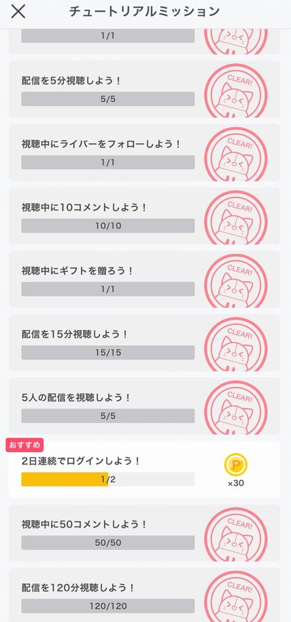 IRIAM(イリアム)チュートリアル全突破は配信系アプリのポイ活の中では一番簡単なので非常におすすめです。2日連続ログインミッション以外は全て1日(2~3時間の視聴やコメント作業)で終わります。