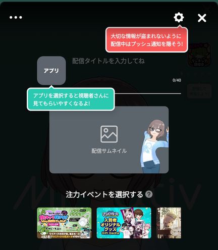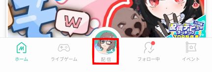 ホーム画面下部中央の「配信」をタップすると準備画面に移行します。