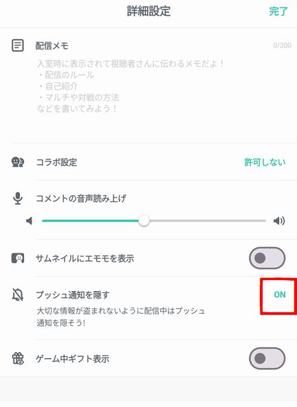 プッシュ通知を隠すをONの設定にしておくと安心です、