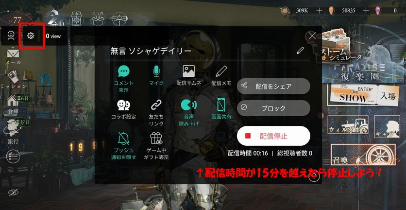 配信を終える時は画面上部の歯車マークをタップして「配信停止」を押しましょう。