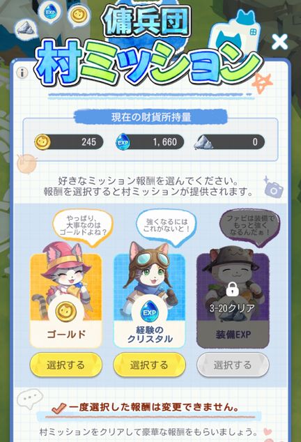 村ミッションの報酬選択は経験のクリスタル選択が良いでしょう。
