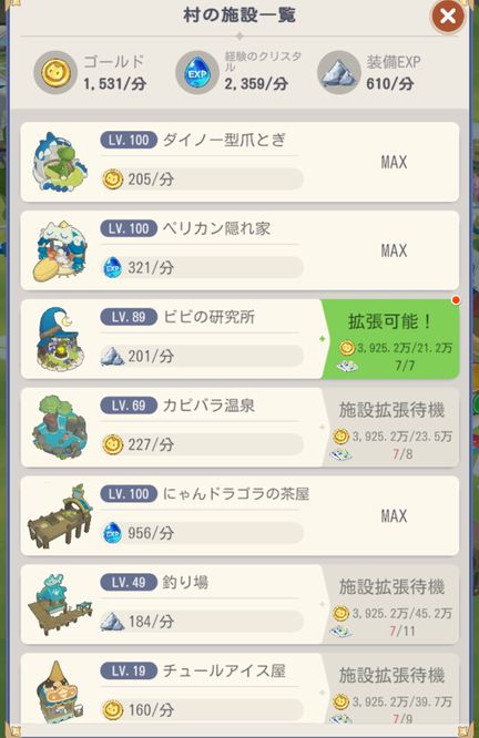 11-35クリア時の各施設レベルはこんな感じでした。ダイノー型爪とぎを一番最初にMaxにして、次に経験のクリスタル生産値が上がる施設を重点的に上げていきました。