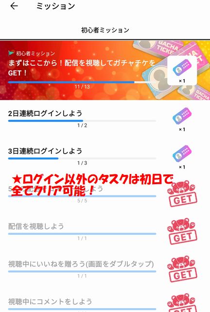ミッションはどれも簡単なタスクばかりなので、特につまずくポイントもないと思います。連続ログイン以外のタスクはすべて初日にクリア出来ます。