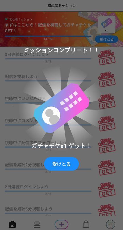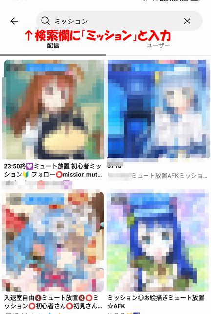 アプリ内上部の検索欄に「ミッション」と入力すれば初心者ミッションを消化させてくれる配信と配信者さんを見つける事が出来ます。ありがたく消化させてもらいましょう。